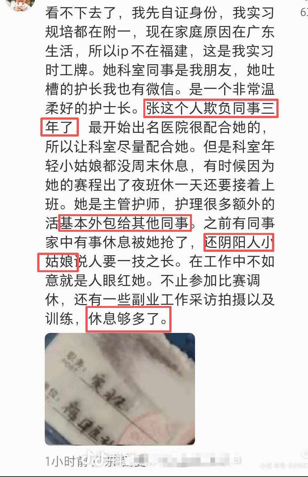 一位自称前实习生的网友站出来指控,称张水华长期欺负同事,频繁因为训练、采访等个人事由,挤占他人的休息时间。