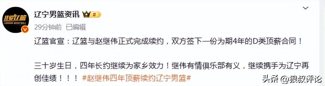 北京时间8月25日,根据辽宁男篮官方社交媒体公示,我俱乐部与球队核心后卫赵继伟签下一份为期4年的D类顶薪合同,引发外界的热议,这也大概率是赵继伟CBA职业生涯最后一份长约,4年之后,赵继伟将会获得签下老将合同的资格。