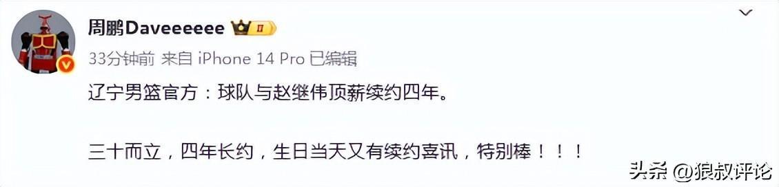 辽宁男篮官方盛赞赵继伟点评说道: